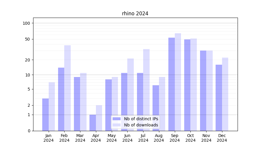 Number of downloads for software package rhino, year by year, from 2025 back to 2014 (years with no downloads are omitted):