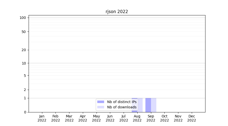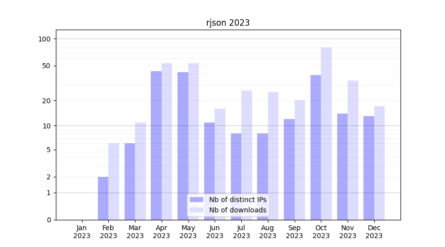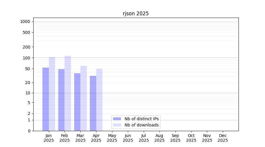 Number of downloads for software package rjson, year by year, from 2025 back to 2014 (years with no downloads are omitted):
