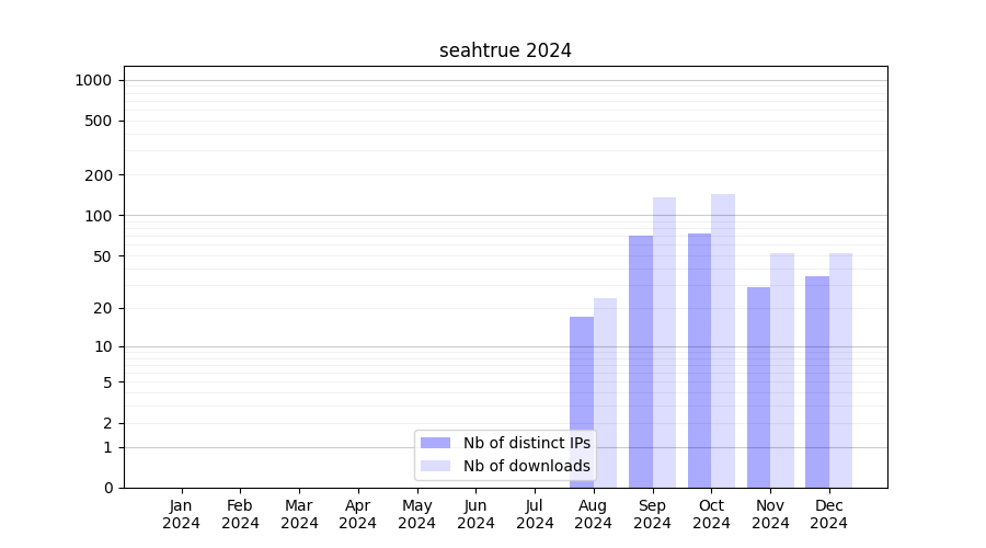 Number of downloads for software package seahtrue, year by year, from 2025 back to 2014 (years with no downloads are omitted):