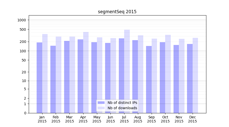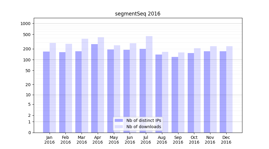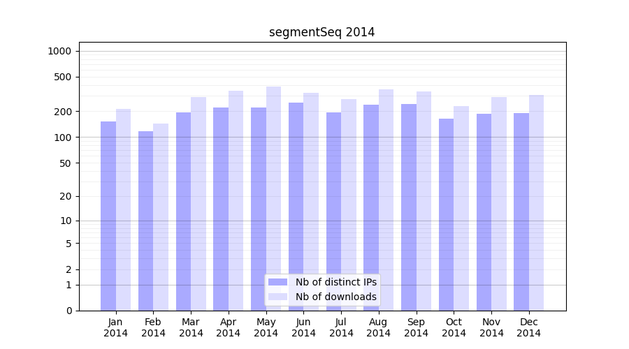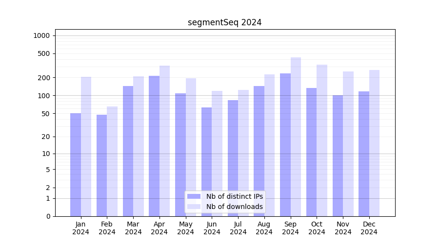 Number of downloads for software package segmentSeq, year by year, from 2025 back to 2014 (years with no downloads are omitted):