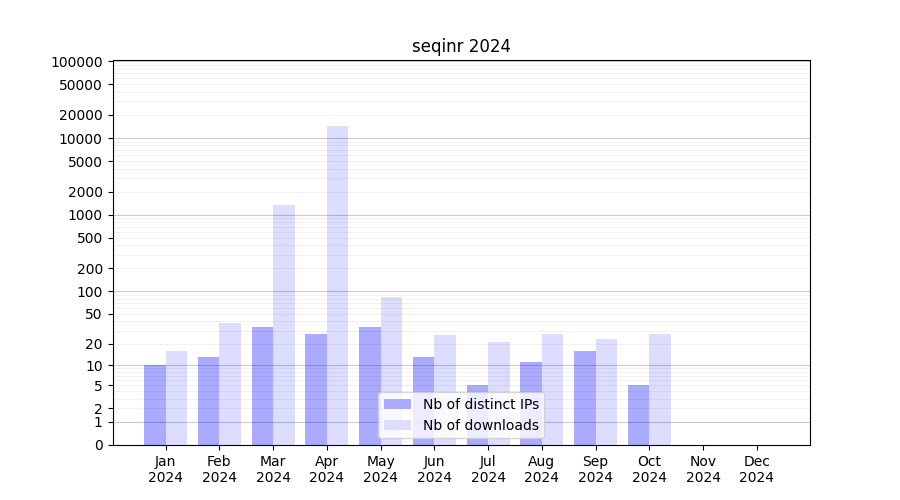 Number of downloads for software package seqinr, year by year, from 2025 back to 2014 (years with no downloads are omitted):