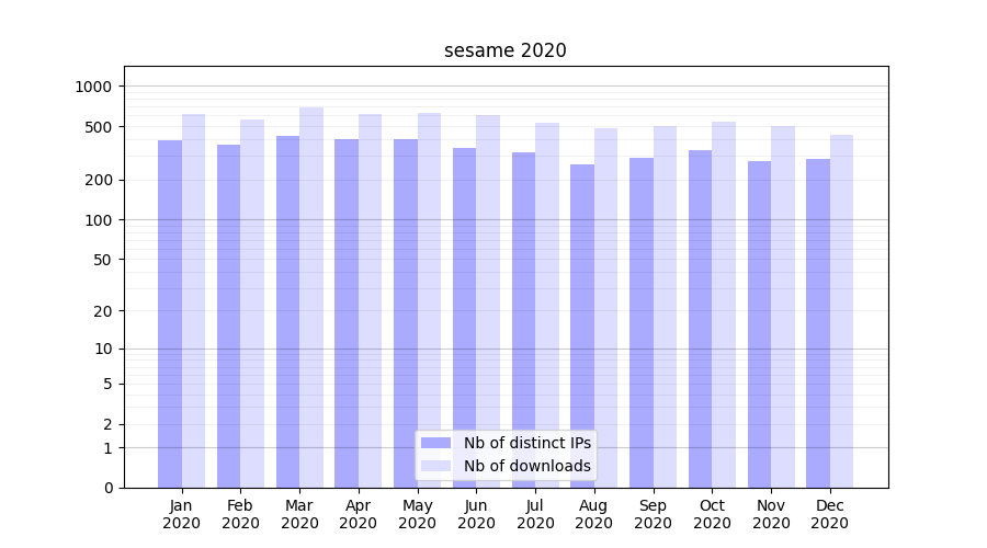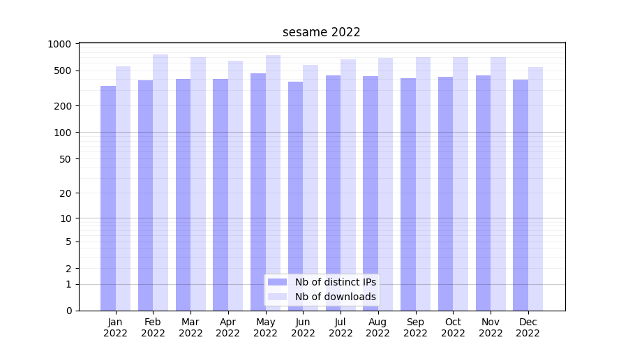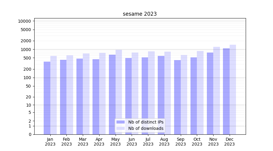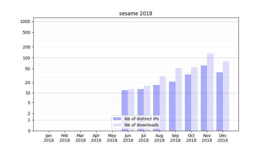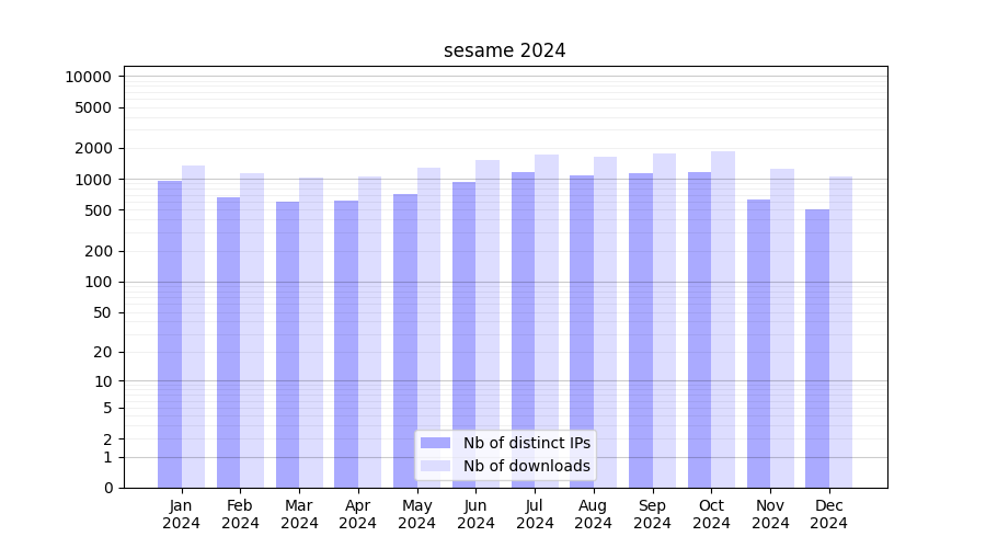 Number of downloads for software package sesame, year by year, from 2025 back to 2014 (years with no downloads are omitted):