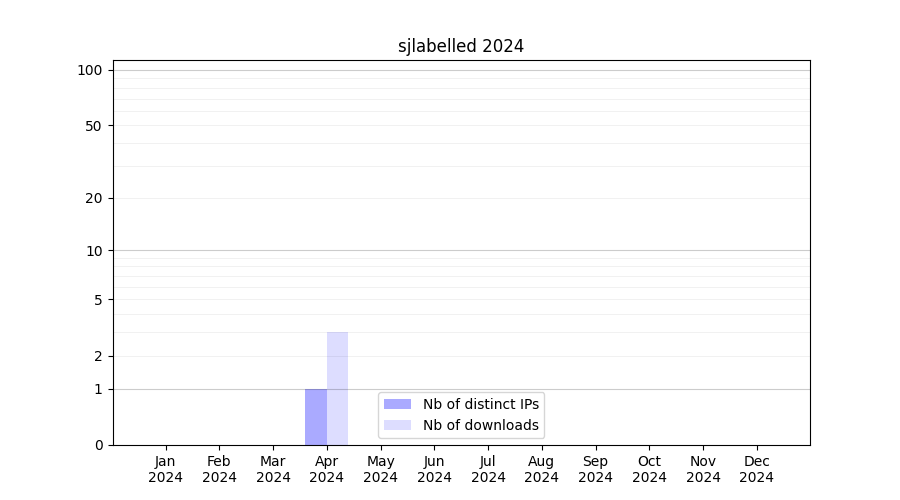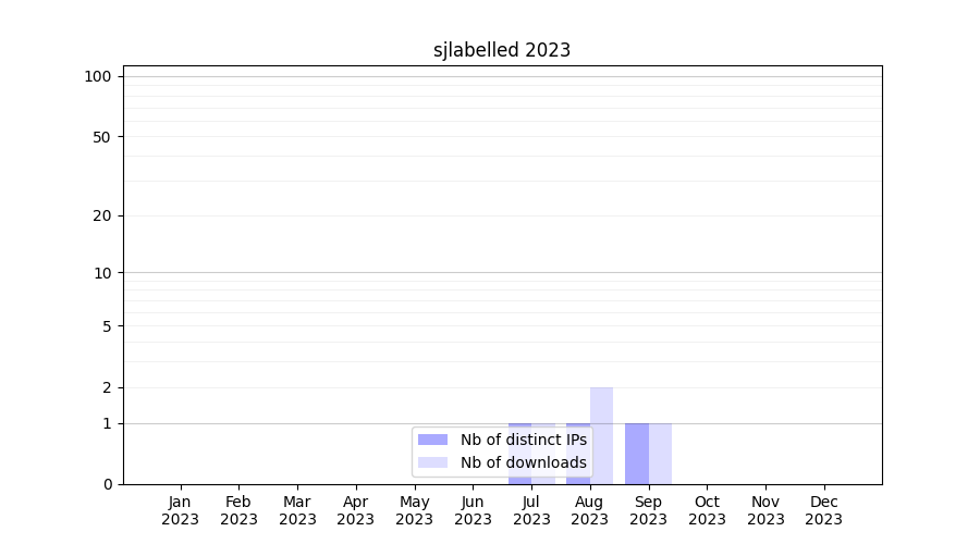 Number of downloads for software package sjlabelled, year by year, from 2025 back to 2014 (years with no downloads are omitted):