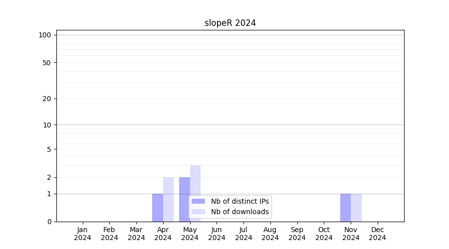 Number of downloads for software package slopeR, year by year, from 2025 back to 2014 (years with no downloads are omitted):