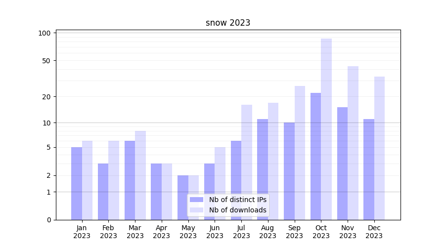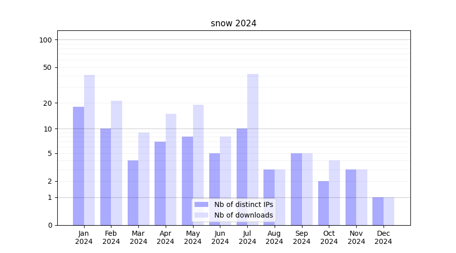 Number of downloads for software package snow, year by year, from 2025 back to 2014 (years with no downloads are omitted):