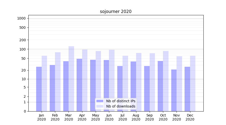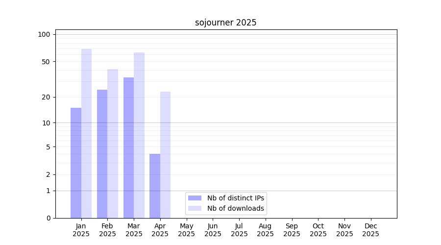 Number of downloads for software package sojourner, year by year, from 2025 back to 2014 (years with no downloads are omitted):