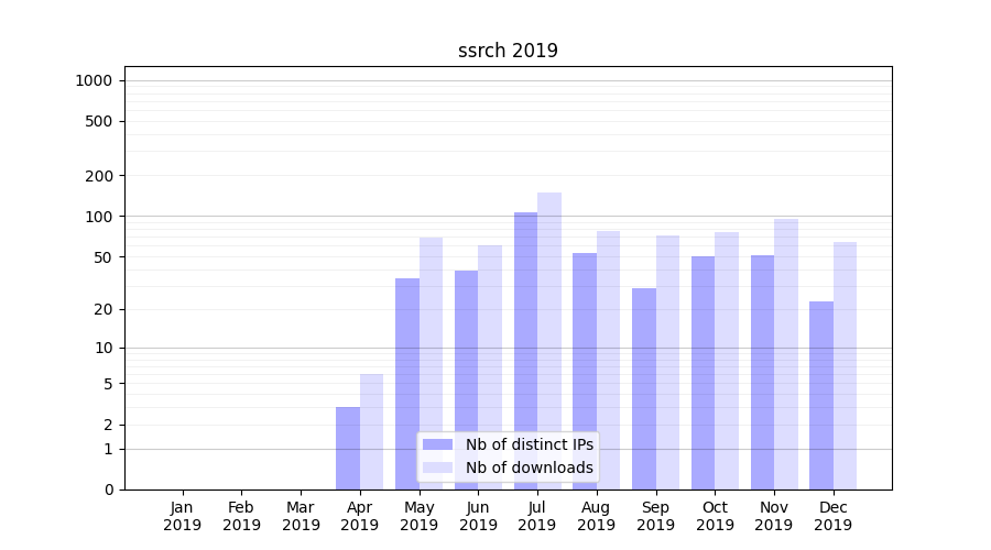 Number of downloads for software package ssrch, year by year, from 2025 back to 2014 (years with no downloads are omitted):
