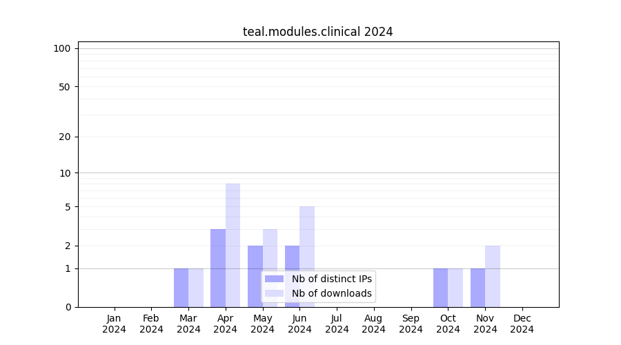 Number of downloads for software package teal.modules.clinical, year by year, from 2025 back to 2014 (years with no downloads are omitted):