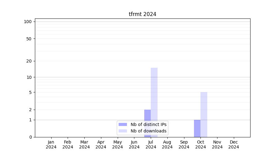 Number of downloads for software package tfrmt, year by year, from 2025 back to 2014 (years with no downloads are omitted):