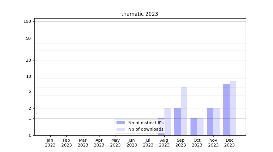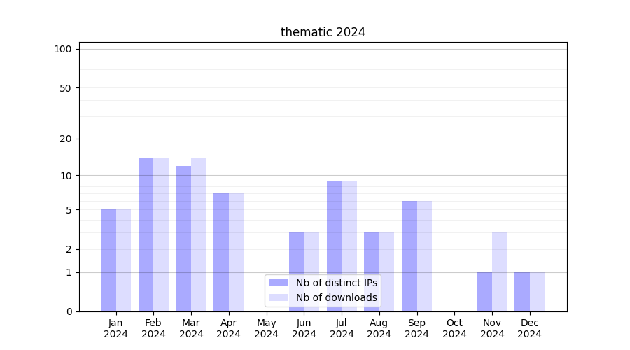 Number of downloads for software package thematic, year by year, from 2025 back to 2014 (years with no downloads are omitted):