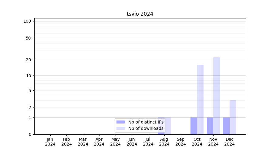 Number of downloads for software package tsvio, year by year, from 2025 back to 2014 (years with no downloads are omitted):