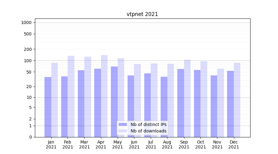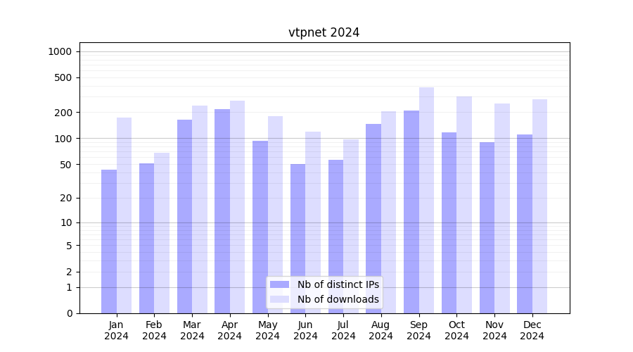 Number of downloads for software package vtpnet, year by year, from 2025 back to 2014 (years with no downloads are omitted):