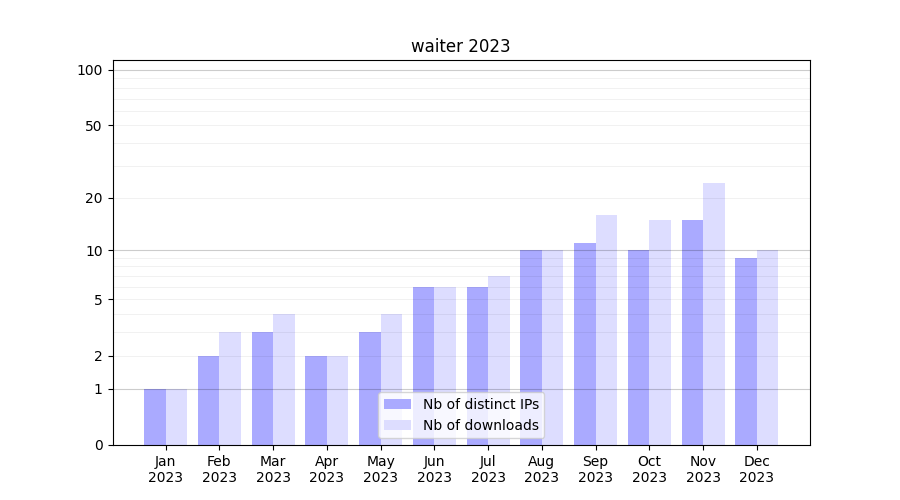 Number of downloads for software package waiter, year by year, from 2025 back to 2014 (years with no downloads are omitted):