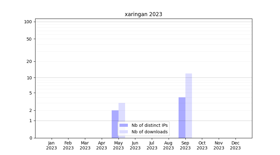Number of downloads for software package xaringan, year by year, from 2025 back to 2014 (years with no downloads are omitted):
