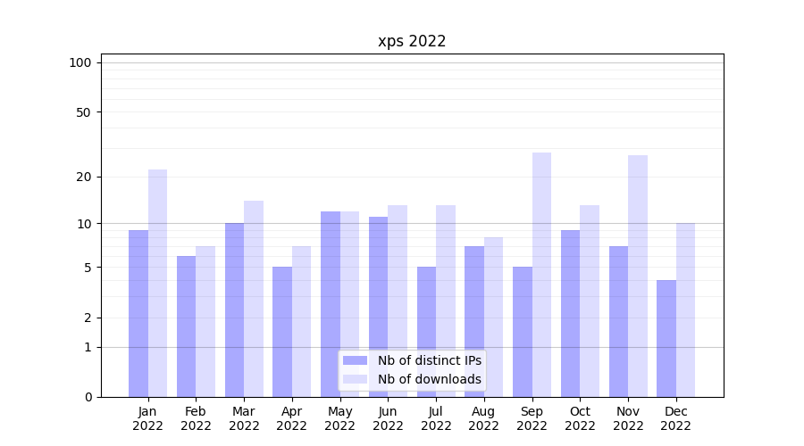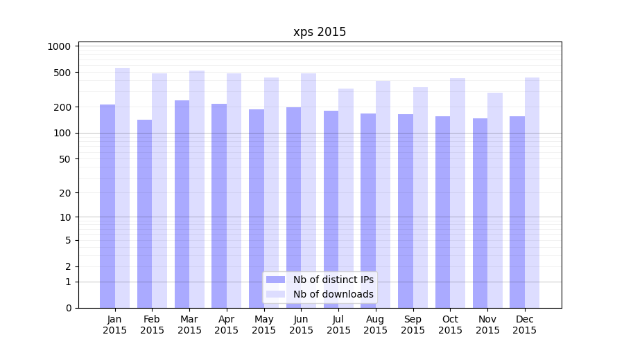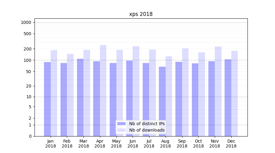 Number of downloads for software package xps, year by year, from 2025 back to 2014 (years with no downloads are omitted):