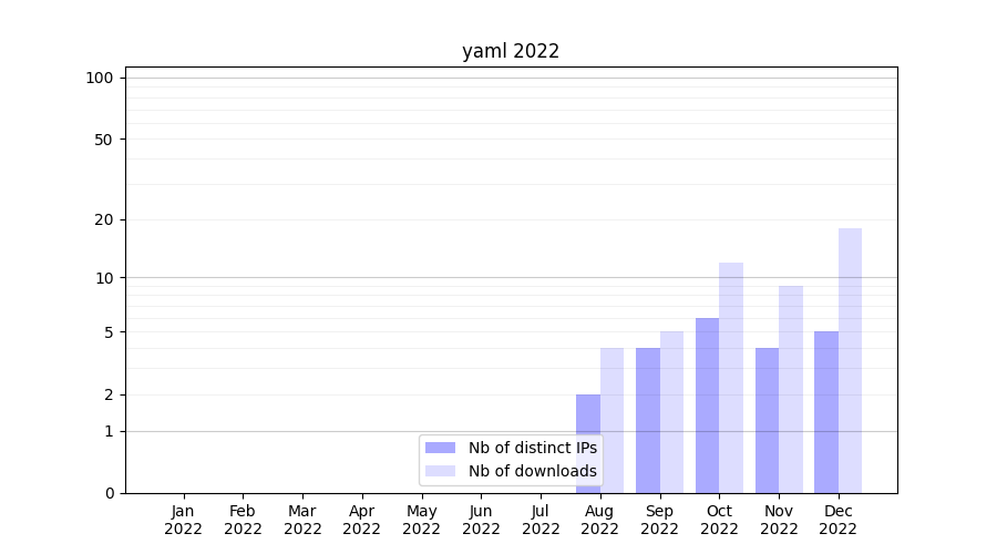 Number of downloads for software package yaml, year by year, from 2025 back to 2014 (years with no downloads are omitted):
