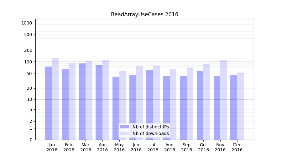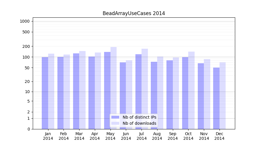 Number of downloads for experiment package BeadArrayUseCases, year by year, from 2025 back to 2014 (years with no downloads are omitted):
