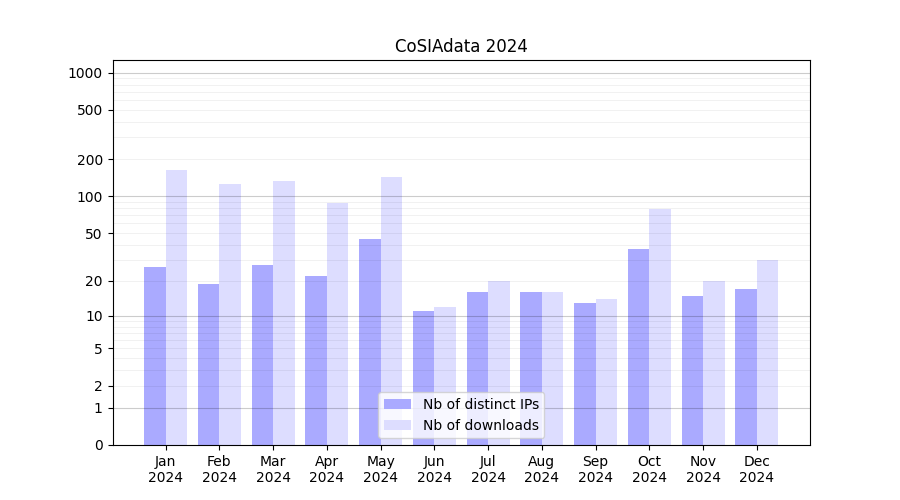 Number of downloads for experiment package CoSIAdata, year by year, from 2025 back to 2014 (years with no downloads are omitted):
