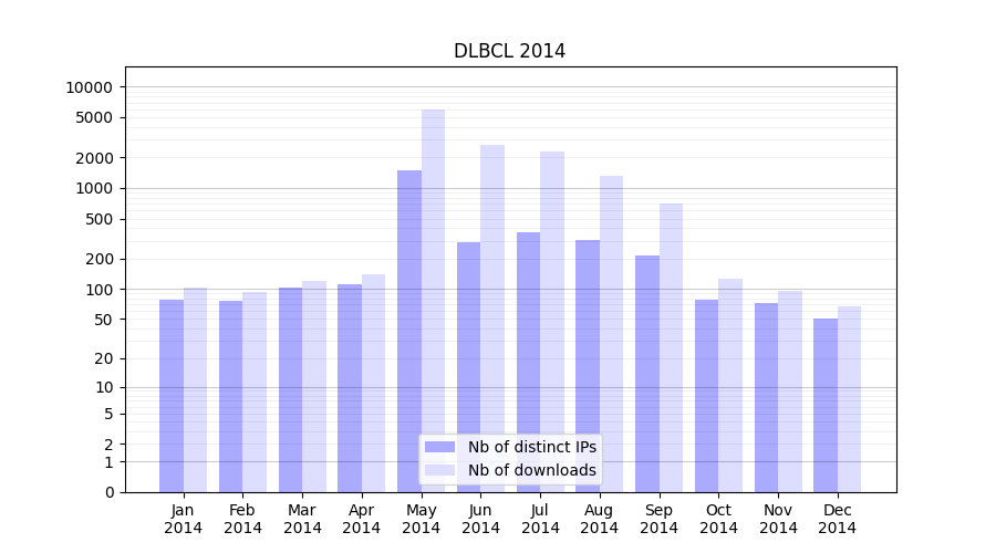 Number of downloads for experiment package DLBCL, year by year, from 2025 back to 2014 (years with no downloads are omitted):