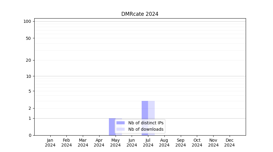 Number of downloads for experiment package DMRcate, year by year, from 2025 back to 2014 (years with no downloads are omitted):