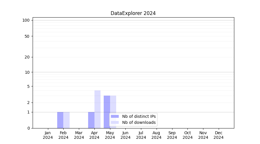 Number of downloads for experiment package DataExplorer, year by year, from 2025 back to 2014 (years with no downloads are omitted):