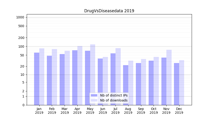 Number of downloads for experiment package DrugVsDiseasedata, year by year, from 2025 back to 2014 (years with no downloads are omitted):