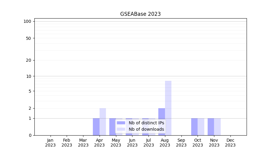 Number of downloads for experiment package GSEABase, year by year, from 2025 back to 2014 (years with no downloads are omitted):