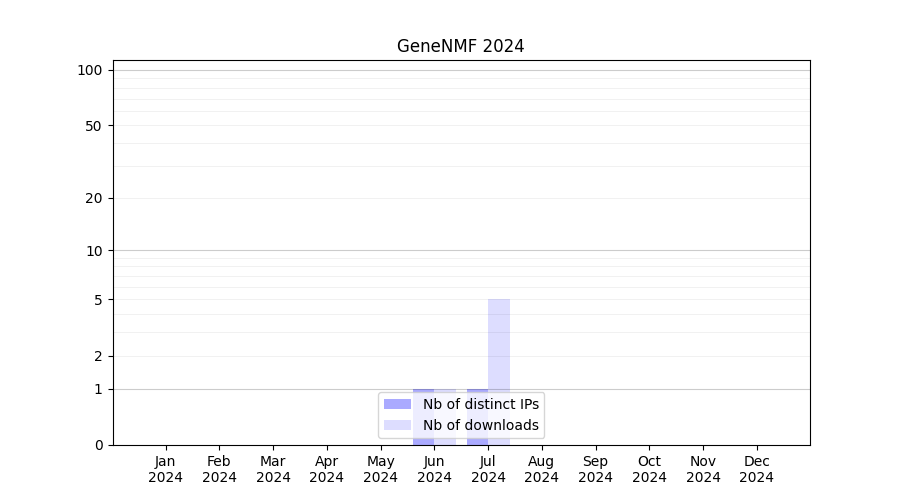 Number of downloads for experiment package GeneNMF, year by year, from 2025 back to 2014 (years with no downloads are omitted):