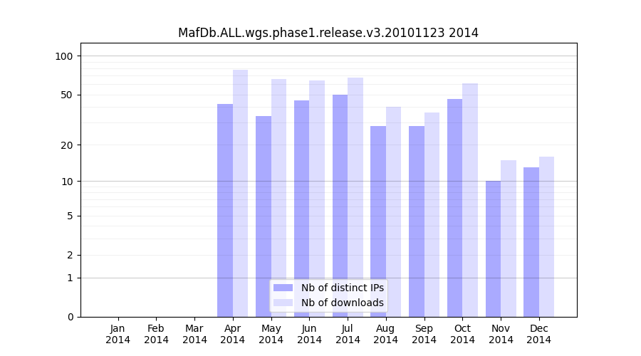 Number of downloads for experiment package MafDb.ALL.wgs.phase1.release.v3.20101123, year by year, from 2025 back to 2014 (years with no downloads are omitted):