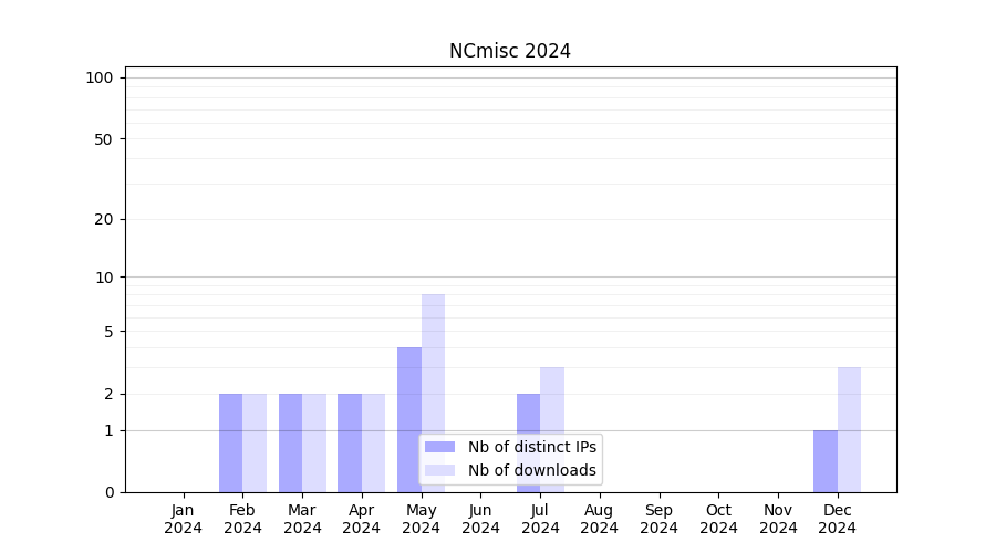 Number of downloads for experiment package NCmisc, year by year, from 2025 back to 2014 (years with no downloads are omitted):