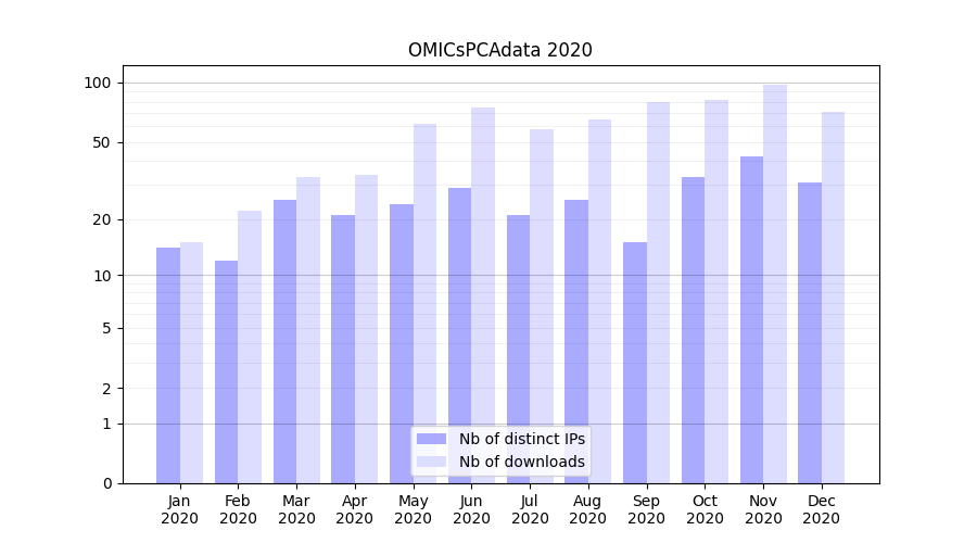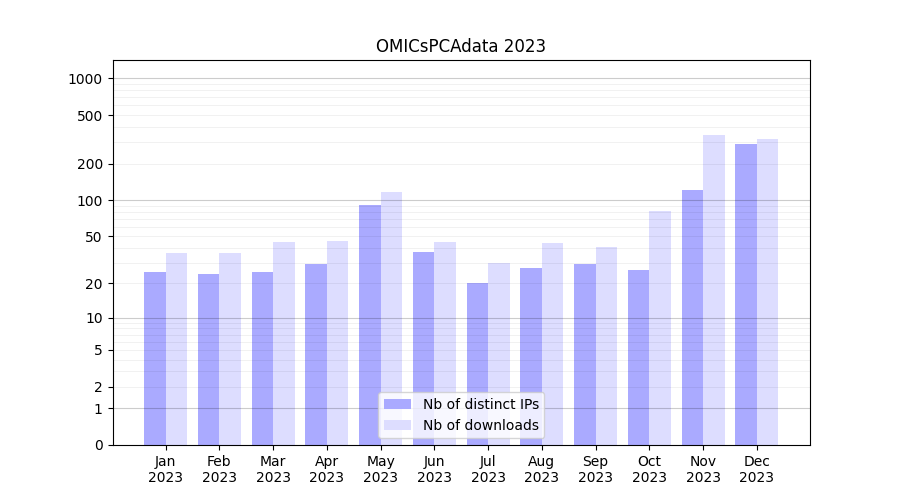 Number of downloads for experiment package OMICsPCAdata, year by year, from 2025 back to 2014 (years with no downloads are omitted):