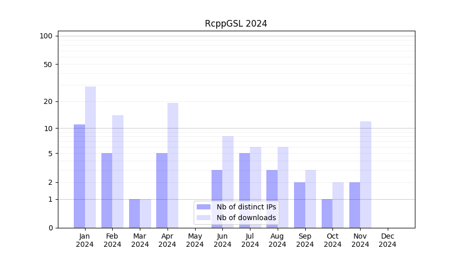 Number of downloads for experiment package RcppGSL, year by year, from 2025 back to 2014 (years with no downloads are omitted):