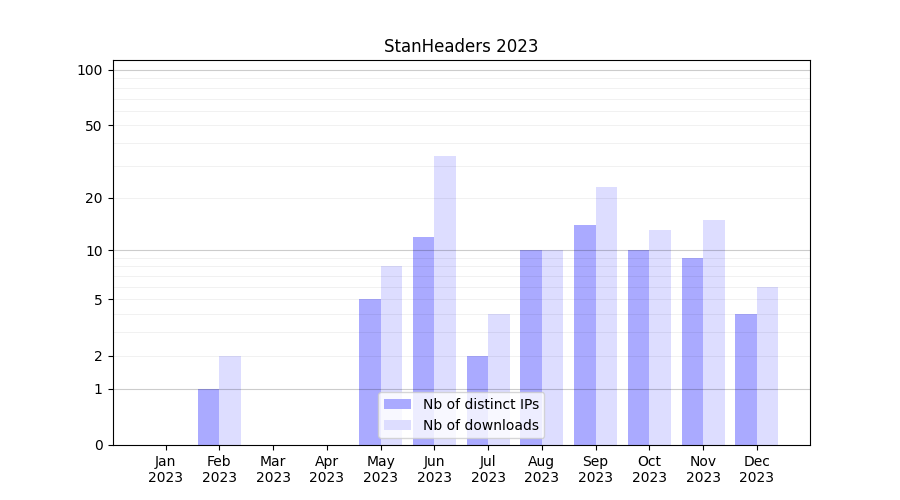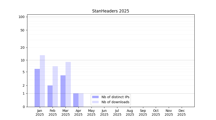 Number of downloads for experiment package StanHeaders, year by year, from 2025 back to 2014 (years with no downloads are omitted):