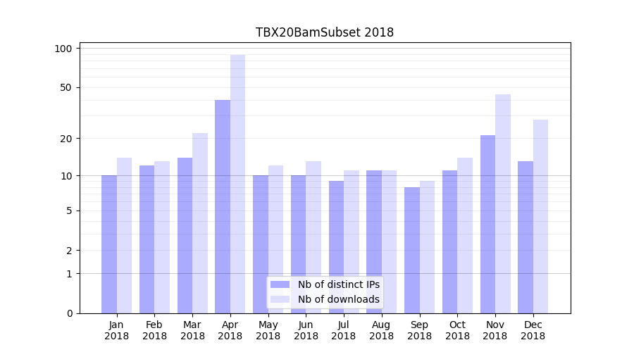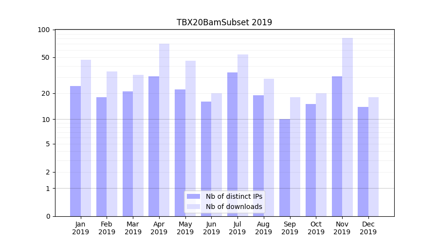 Number of downloads for experiment package TBX20BamSubset, year by year, from 2025 back to 2014 (years with no downloads are omitted):