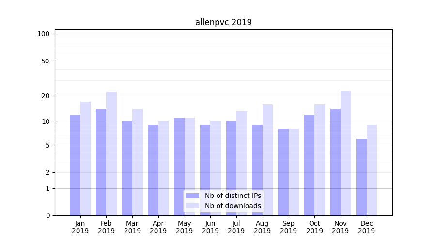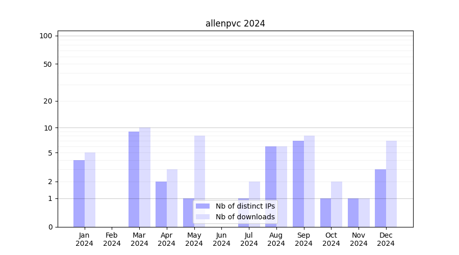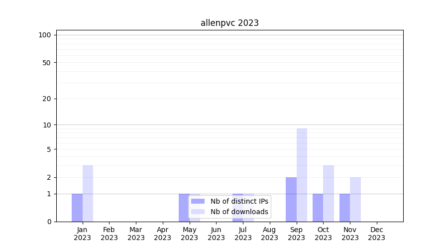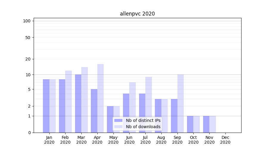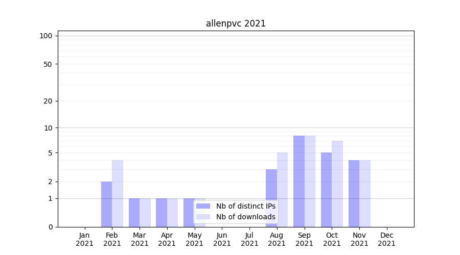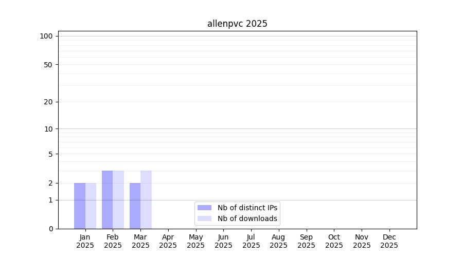 Number of downloads for experiment package allenpvc, year by year, from 2025 back to 2014 (years with no downloads are omitted):
