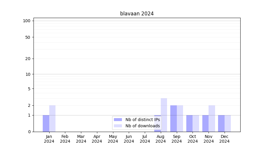 Number of downloads for experiment package blavaan, year by year, from 2025 back to 2014 (years with no downloads are omitted):