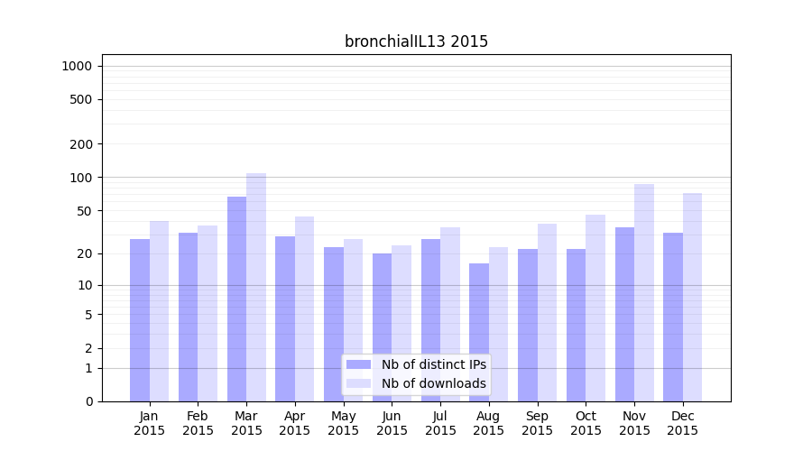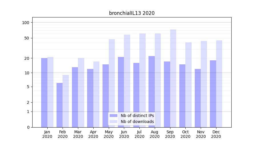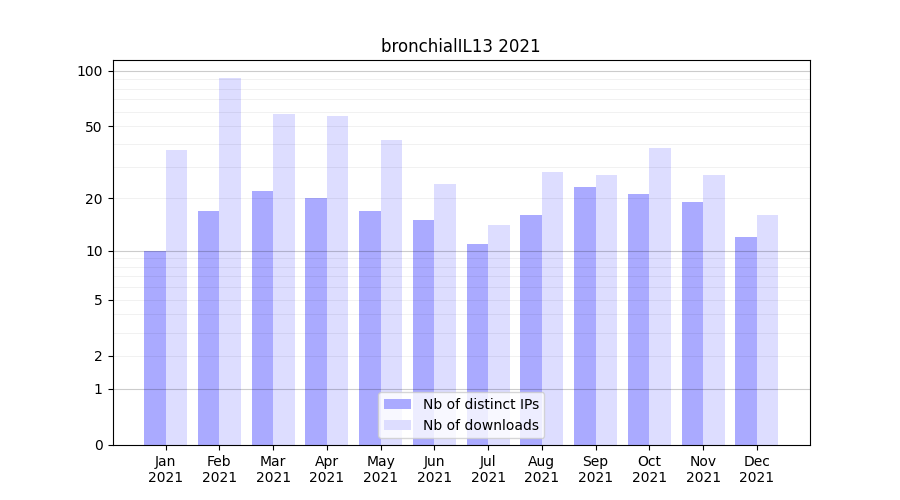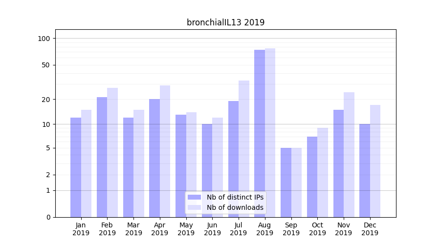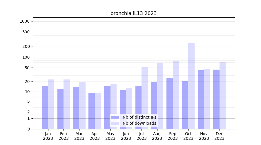 Number of downloads for experiment package bronchialIL13, year by year, from 2025 back to 2014 (years with no downloads are omitted):