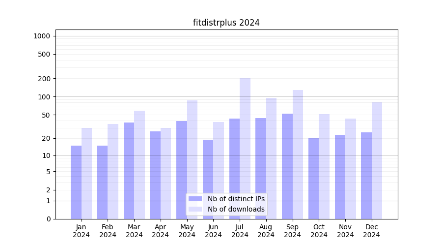Number of downloads for experiment package fitdistrplus, year by year, from 2025 back to 2014 (years with no downloads are omitted):
