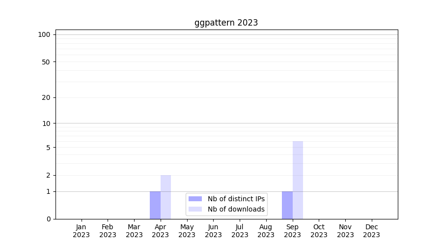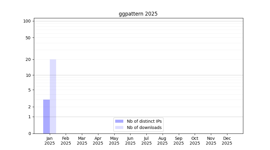 Number of downloads for experiment package ggpattern, year by year, from 2025 back to 2014 (years with no downloads are omitted):