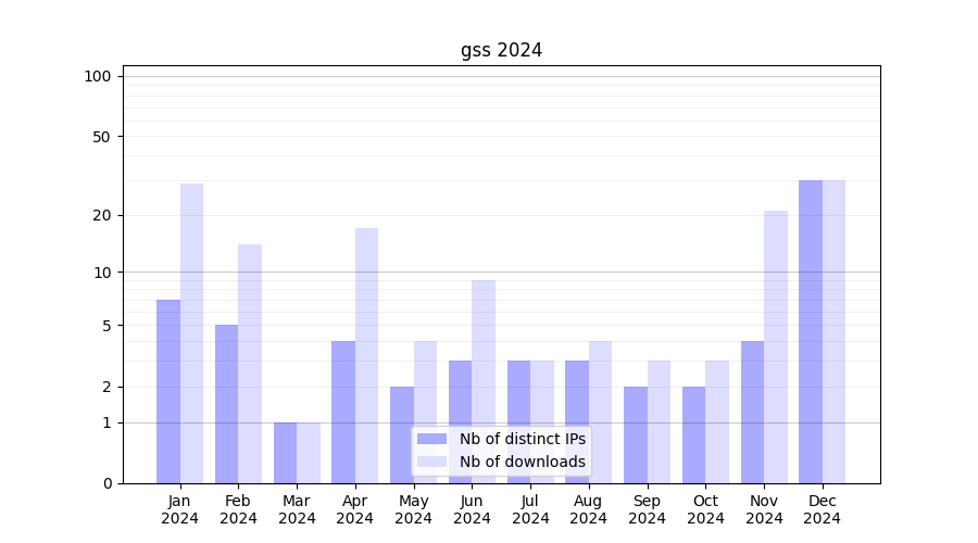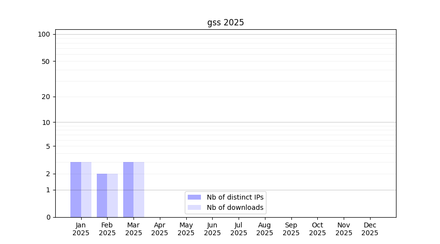 Number of downloads for experiment package gss, year by year, from 2025 back to 2014 (years with no downloads are omitted):