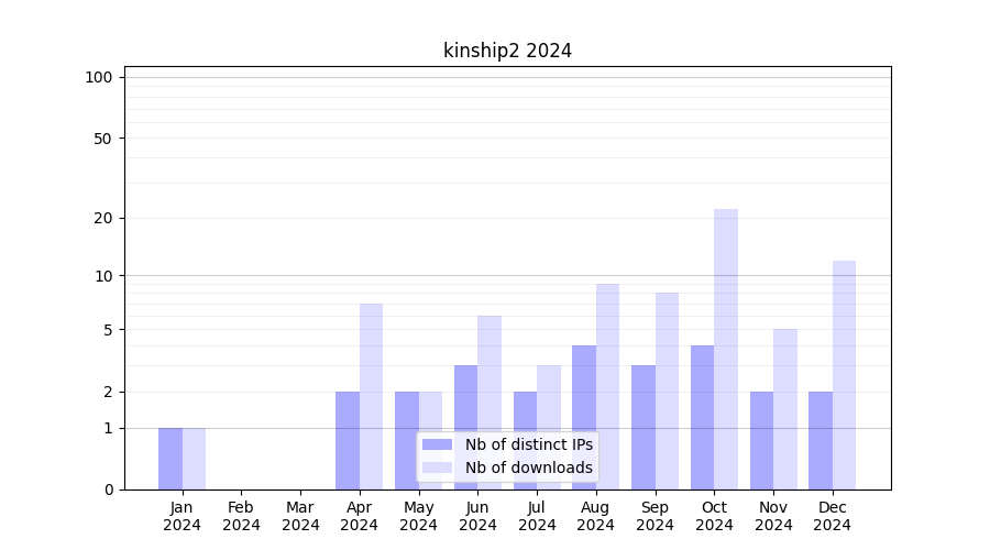 Number of downloads for experiment package kinship2, year by year, from 2025 back to 2014 (years with no downloads are omitted):