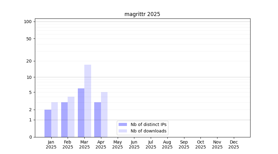 Number of downloads for experiment package magrittr, year by year, from 2025 back to 2014 (years with no downloads are omitted):