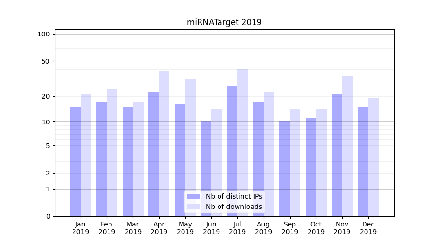 Number of downloads for experiment package miRNATarget, year by year, from 2025 back to 2014 (years with no downloads are omitted):