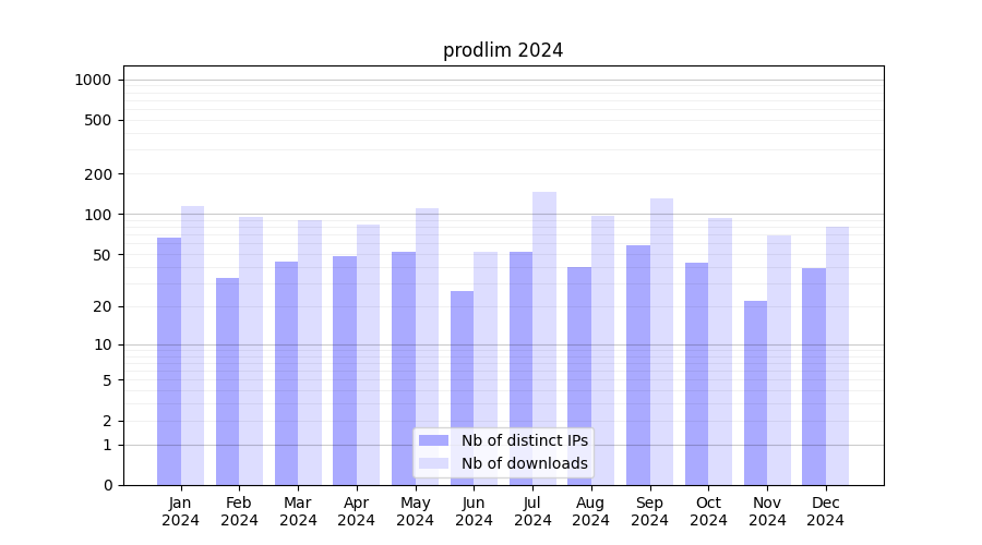 Number of downloads for experiment package prodlim, year by year, from 2025 back to 2014 (years with no downloads are omitted):