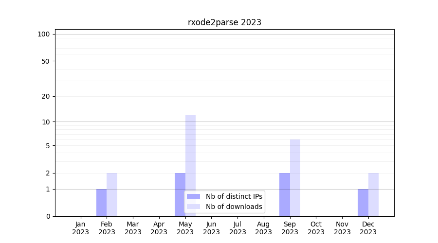 Number of downloads for experiment package rxode2parse, year by year, from 2025 back to 2014 (years with no downloads are omitted):