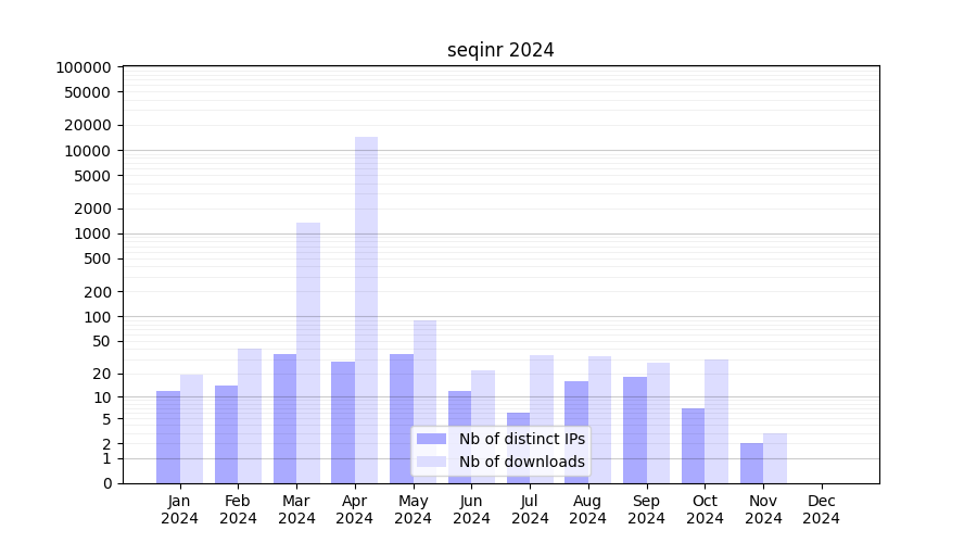 Number of downloads for experiment package seqinr, year by year, from 2025 back to 2014 (years with no downloads are omitted):