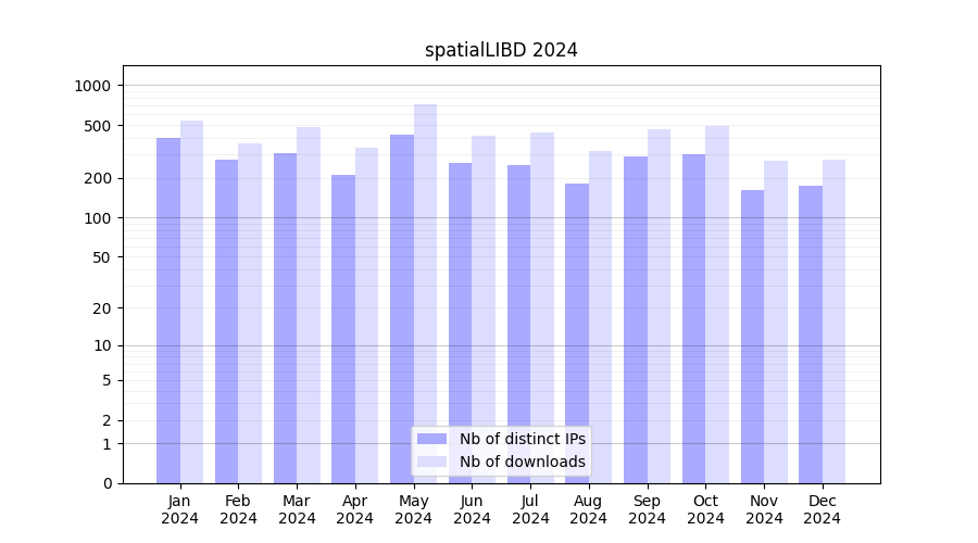 Number of downloads for experiment package spatialLIBD, year by year, from 2025 back to 2014 (years with no downloads are omitted):
