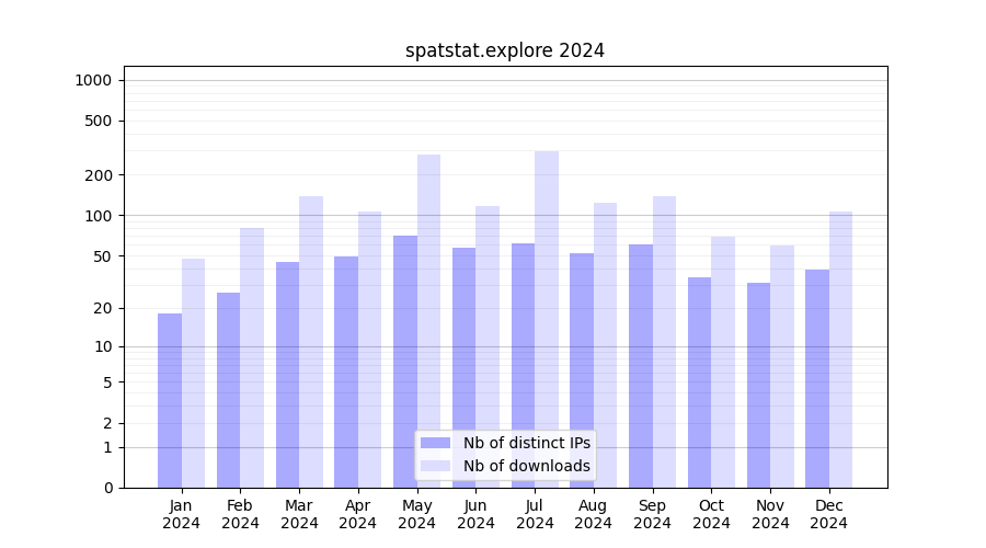 Number of downloads for experiment package spatstat.explore, year by year, from 2025 back to 2014 (years with no downloads are omitted):
