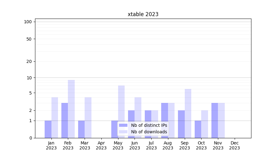 Number of downloads for experiment package xtable, year by year, from 2025 back to 2014 (years with no downloads are omitted):