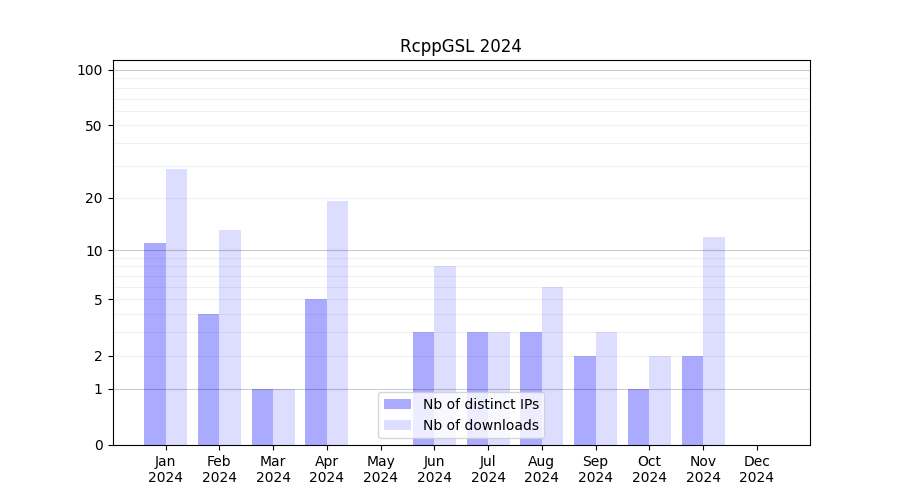Number of downloads for workflow package RcppGSL, year by year, from 2025 back to 2015 (years with no downloads are omitted):